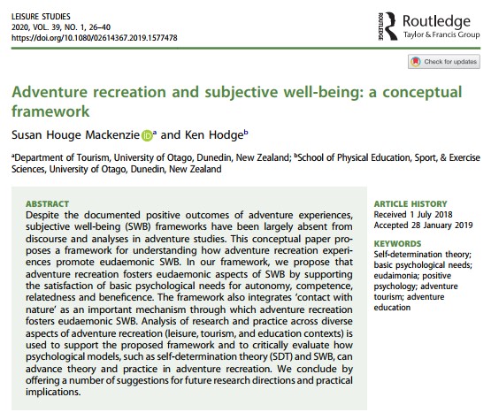 ①모험은 전통적으로 전통적인 신체 활동(예: 팀 스포츠 등)에 대한 보편화된 접근 가능한 대안으로 여겨지지 않았음. 모험이 어떻게 에우다모닉적인 주관적 웰빙(SWB)을 지원하는지를 설명하는 프레임워크는 모험 레크리에이션에 대한 건강과 웰빙 지향적인 접근을 촉진할 수 있음.