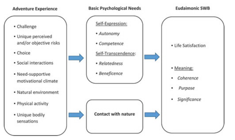 -주관적 행복(SWB)프레임워크에 따르면, 모험 레크리에이션 경험은 리더나 동료에 의해 조성된 동기부여적 환경이 필요한 지원을 제공함과 동시에 네 가지 기본적인 심리적 욕구를 충족시키는 데 성공함.