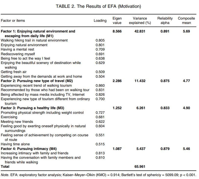 ① 하이킹 관광객의 동기부여 4가지 요인구조를 EFA를 통해 나타냄
