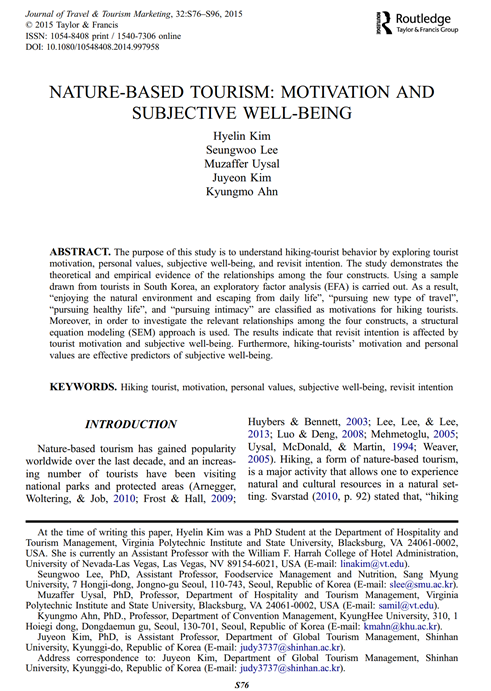 하이킹은 심리적 요인과 건강에 밀접한 관련이 있으며 많은 국가에서 인기활동으로 여겨져 왔으나, 하이킹 관광객의 행동과 그들이 어떻게 그들이 주관적 웰빙에 기여하는 지에 대한 연구는 부족하였음. 단순히 관광 관련 만족도 및 재방문의도라는 변수가 아닌 주관적 웰빙과 같은 변수를 확인해 보기 위해 관광객의 동기, 개인적 가치, 주관적 웰빙, 재방문 의도를 살펴보아 하이킹 관광객의 행동을 이해하고자 함.
