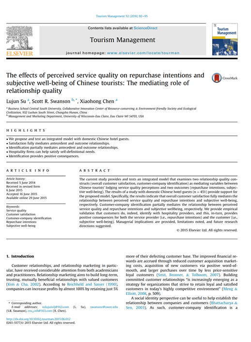 본 연구에서는 고객-회사 관계 인지를 관광/호스피탈리티의 맥락에서 소개하였고. 본 연구는 고객-회사 관계 인지가 인지된 서비스 품질과 재구매 의도와 주관적인 웰빙 사이에서 부분적인 효과를 끼친다는 걸 입증함.