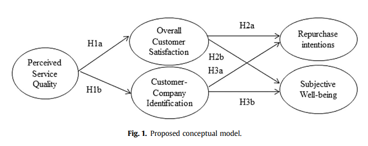 관계 품질(전체 고객 만족도, 고객-회사 식별), 서비스 품질(인식된 서비스 품질) 및 결과(재구매 의도, 주관적 웰빙) 간의 관계 네트워크를 나타내는 개념 모델이 제공됨.