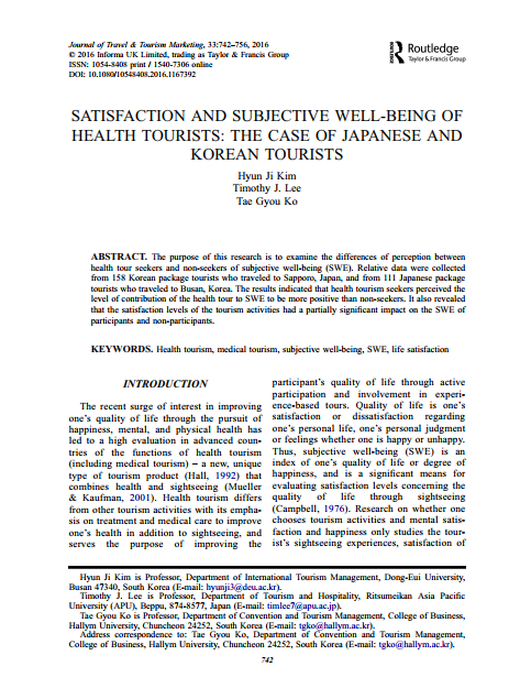 행복·정신·신체 건강 추구를 통해 삶의 질을 향상하는 관심이 급증함. 또한, 건강과 관광이 결합한 새롭고 독특한 유형의 관광 상품이 관심을 받게 되면서 의료관광의 산업 육성이 주목받고 있음. 삶의 질은 개인이 자기 삶에 대해 주관적으로 만족 또는 불만족, 행복 또는 불행하다고 느끼는 개인적인 판단임. 그러하여 본 연구는 건강 관광을 추구하는 사람들과 주관적 웰빙(SWE)을 추구하는 사람들 사이의 인식 차이를 조사하는 곳에 목적을 둠.