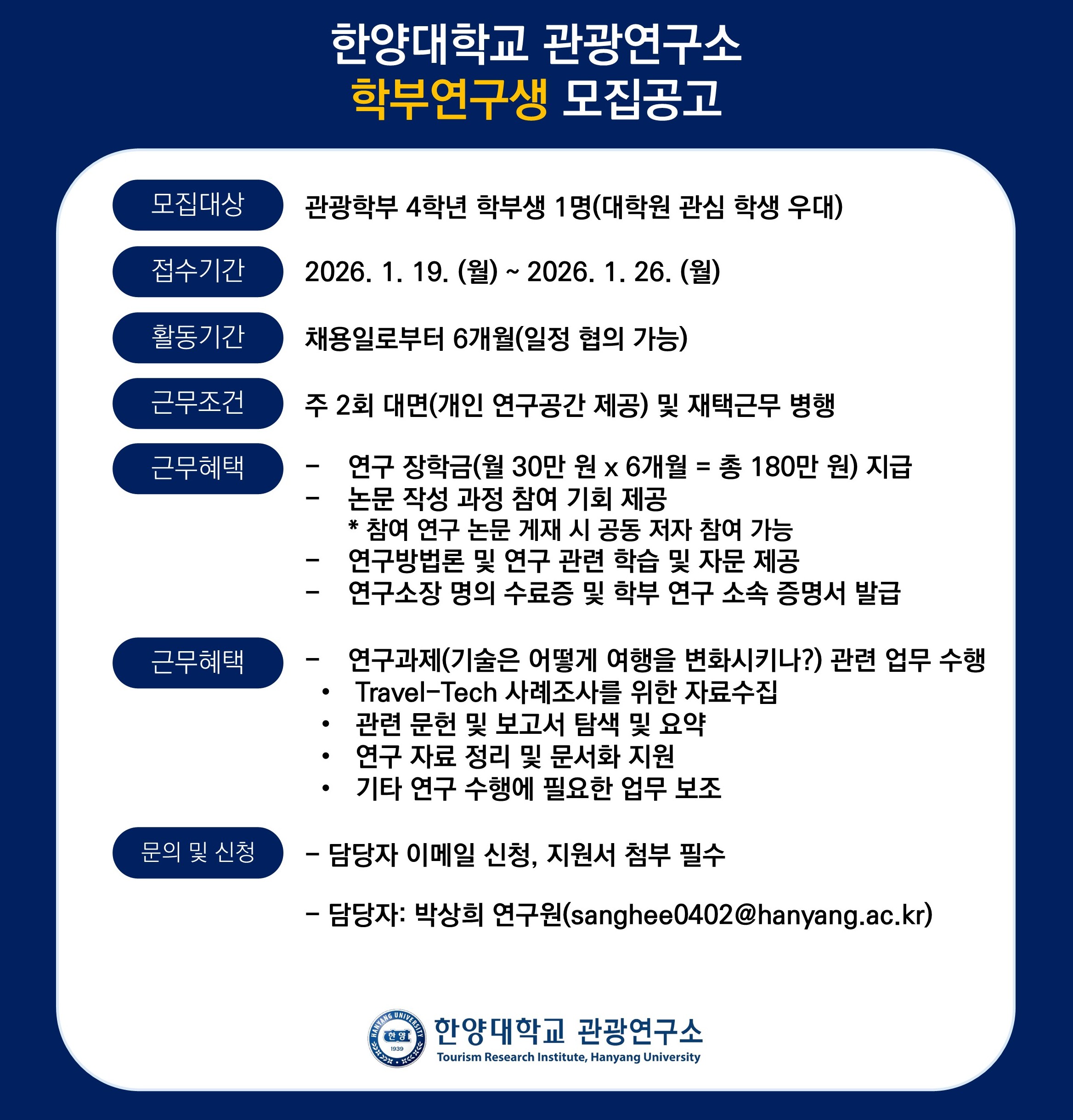 (재공고)[한양대학교 관광연구소] 2026 학부연구생 모집공고