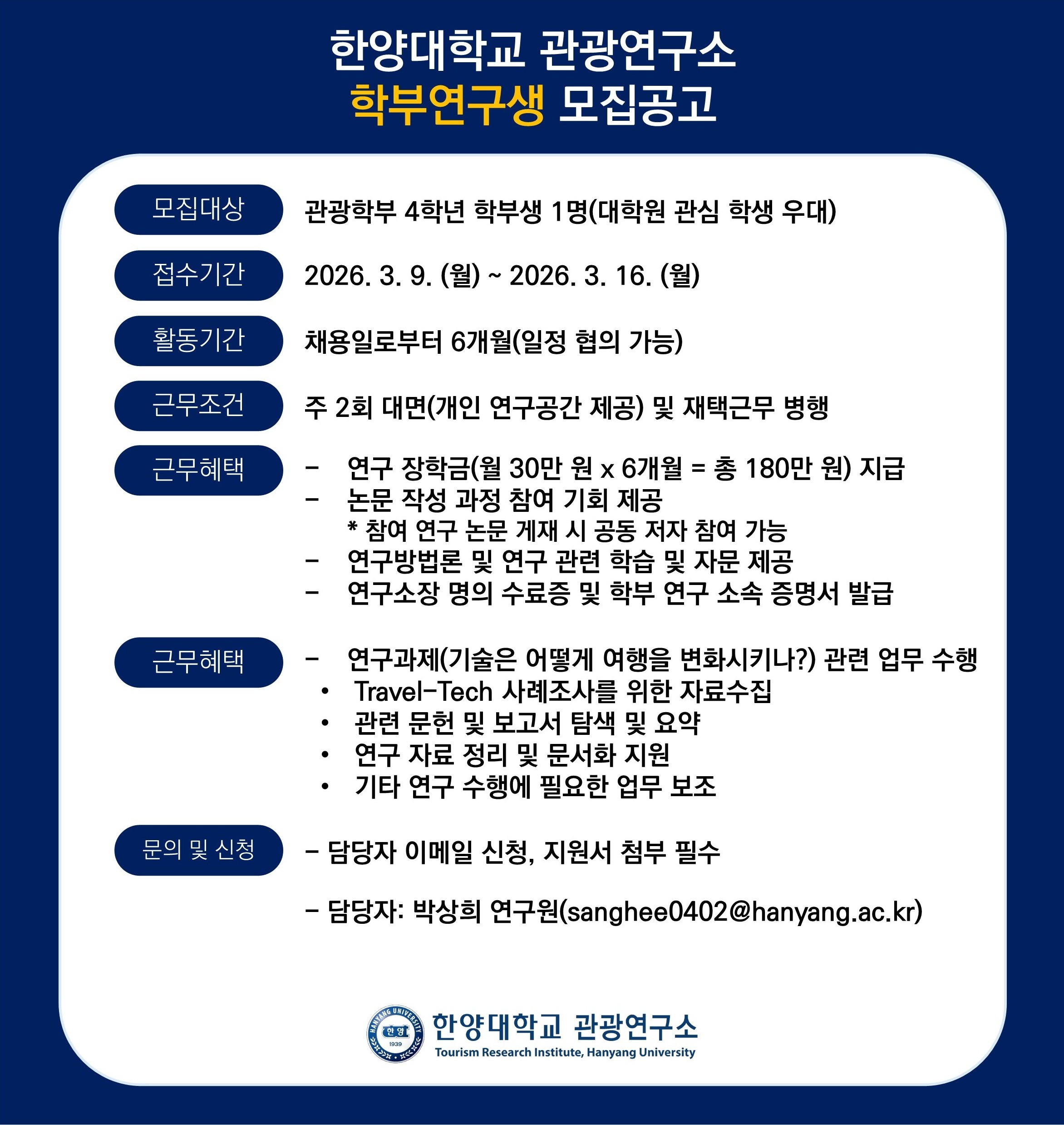 (재공고)[한양대학교 관광연구소] 2026 학부연구생 모집공고